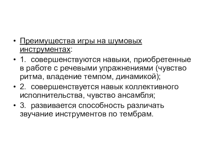 Преимущества игры на шумовых инструментах:1.  совершенствуются навыки, приобретенные в работе с речевыми упражнениями (чувство ритма, владение темпом,
