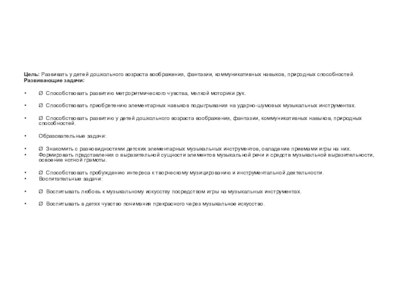 Ø Способствовать пробуждению интереса к творческому музицированию и инструментальной деятельности.