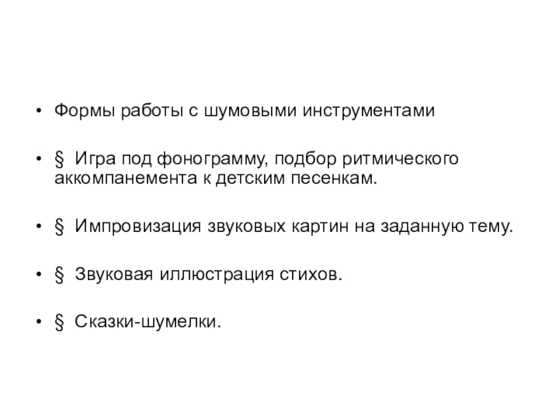 Формы работы с шумовыми инструментами§ Игра под фонограмму, подбор ритмического аккомпанемента к детским песенкам.§ Импровизация звуковых картин