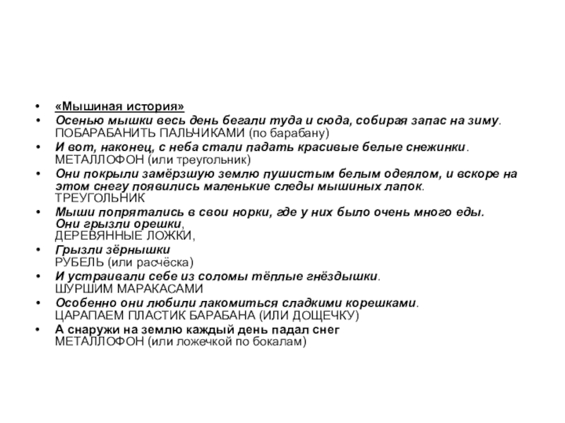 «Мышиная история»Осенью мышки весь день бегали туда и сюда, собирая запас на зиму. ПОБАРАБАНИТЬ ПАЛЬЧИКАМИ (по барабану)И