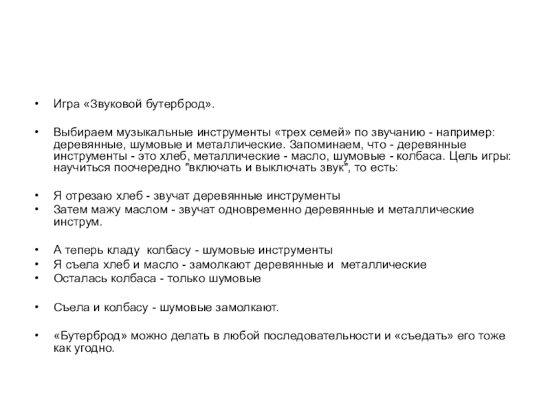 деревянные, шумовые и металлические. Запоминаем, что - деревянные инструменты - это хлеб, металлические - масло, шумовые - колбаса. Цель игры: научиться поочередно "включать и выключать звук", то есть:
