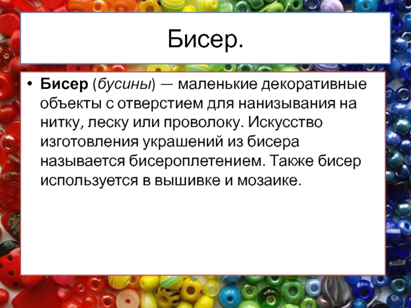 Бисер.Бисер (бусины) — маленькие декоративные объекты с отверстием для нанизывания на нитку, леску или проволоку. Искусство изготовления украшений из