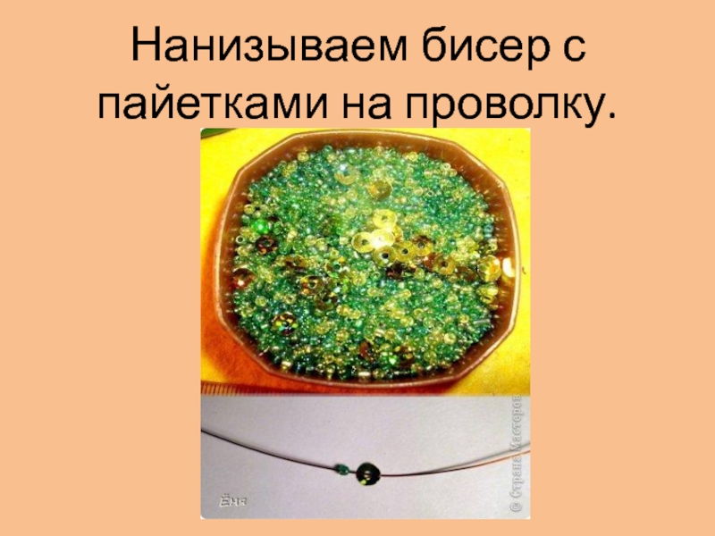 Слайд 9Нанизываем бисер с пайетками на проволку.