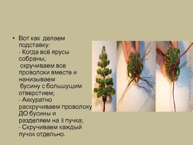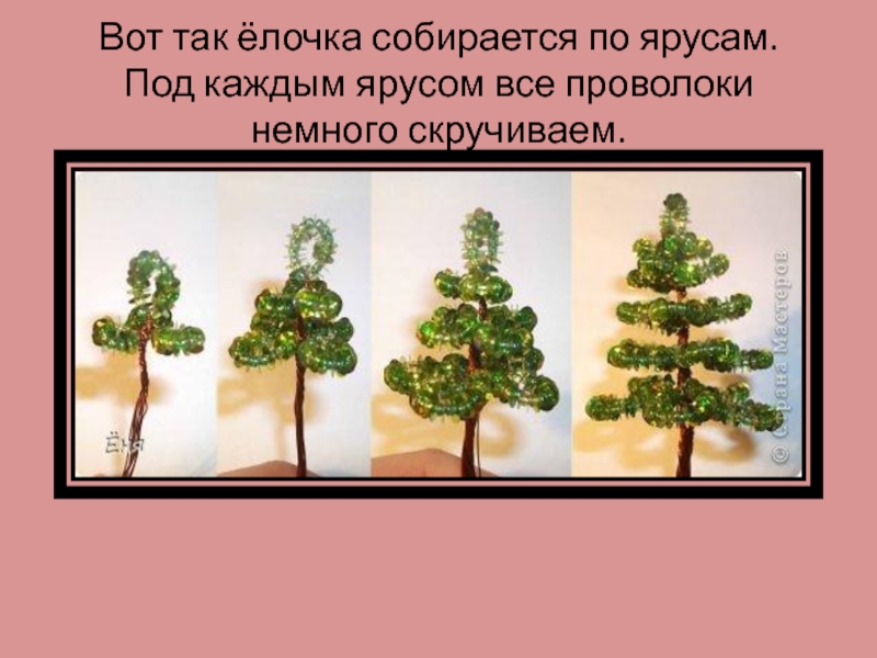 Слайд 11Вот так ёлочка собирается по ярусам. Под каждым ярусом все проволоки немного