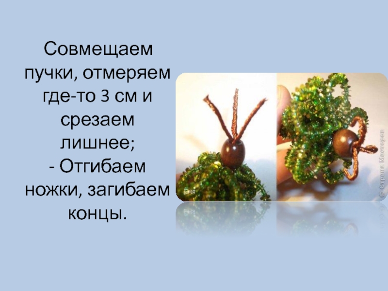 Слайд 13 Совмещаем пучки, отмеряем где-то 3 см и срезаем лишнее; - Отгибаем ножки,