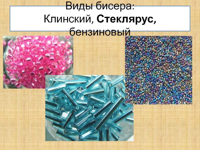 Слайд 6Виды бисера: Клинский, Стеклярус, бензиновый