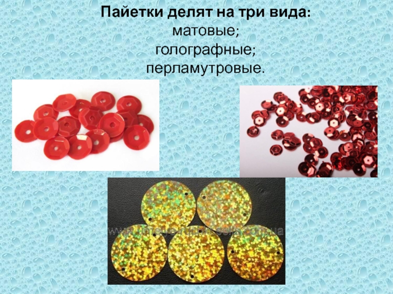 Слайд 3Пайетки делят на три вида: матовые; голографные; перламутровые.