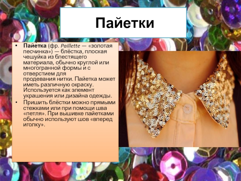 Пайетки Пайе́тка (фр. Paillette — «золотая песчинка») — блёстка, плоская чешуйка из блестящего материала, обычно круглой или многогранной формы и с отверстием для продевания нитки. Пайетка может иметь различную окраску. Используется как элемент украшения или дизайна одежды.Пришить блёстки можно прямыми стежками