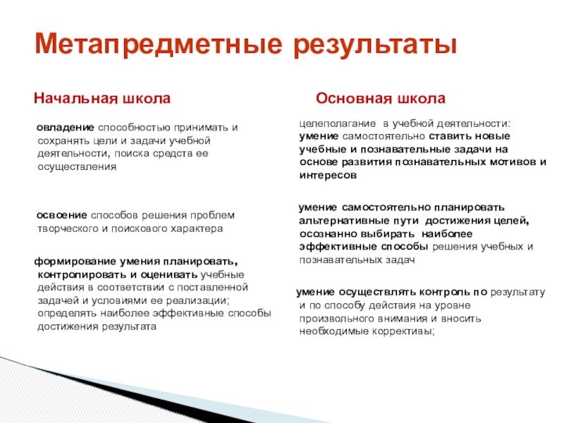метапредметным, включающим освоенные обучающимися универсальные учебные действия, обеспечивающие овладение ключевыми компетенциями, составляющими основу умения учиться, и межпредметными понятиями;