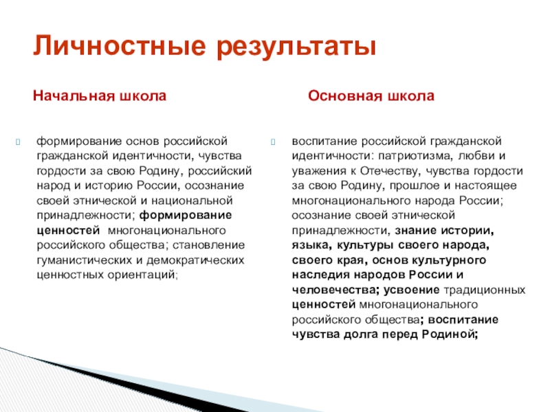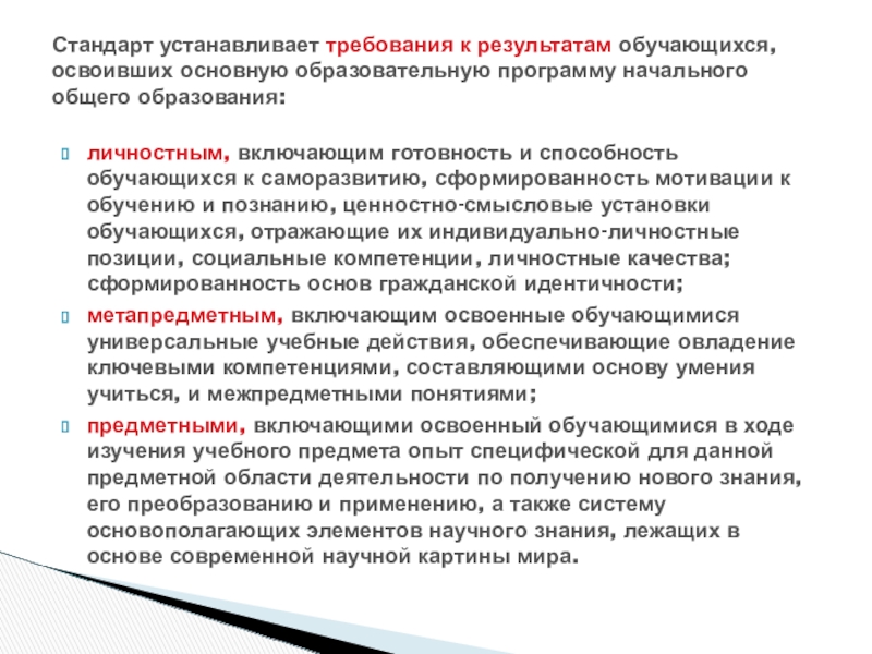 личностным, включающим готовность и способность обучающихся к саморазвитию, сформированность мотивации к обучению и познанию, ценностно-смысловые установки обучающихся, отражающие их индивидуально-личностные позиции, социальные компетенции, личностные качества; сформированность основ гражданской идентичности;