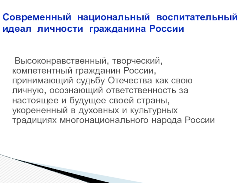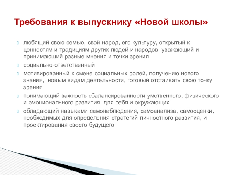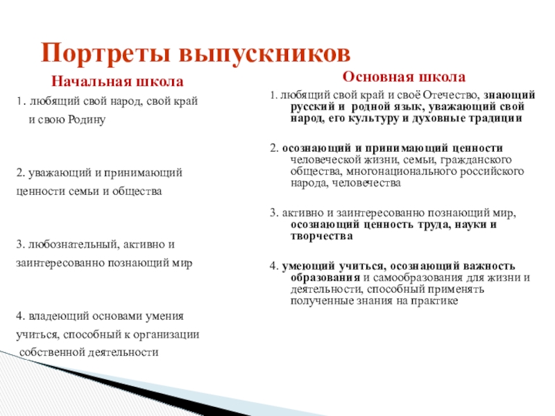 1. любящий свой край и своё Отечество, знающий русский и родной язык, уважающий свой народ, его культуру и духовные традиции