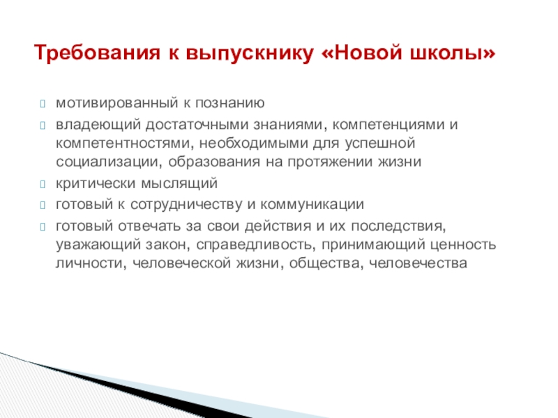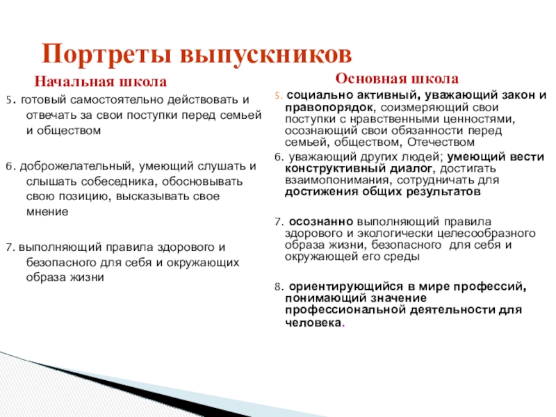 5. социально активный, уважающий закон и правопорядок, соизмеряющий свои поступки с нравственными ценностями, осознающий свои обязанности перед семьей, обществом, Отечеством