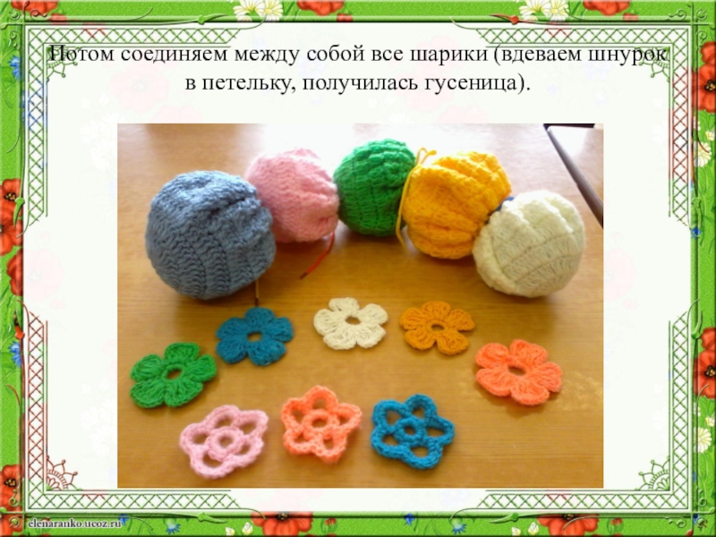 Слайд 4Потом соединяем между собой все шарики (вдеваем шнурок в петельку, получилась
