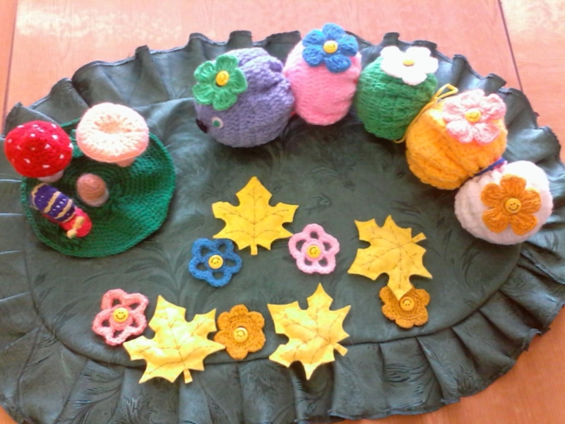 Материал для изготовления игры. Из ниток разного цвета крючком вяжем круги (5 штук) .