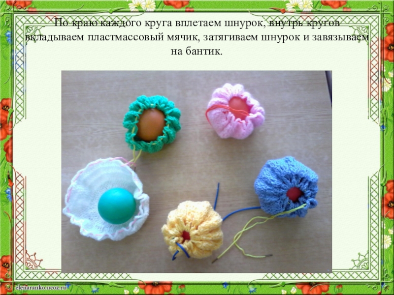 Слайд 3По краю каждого круга вплетаем шнурок, внутрь кругов вкладываем пластмассовый мячик,