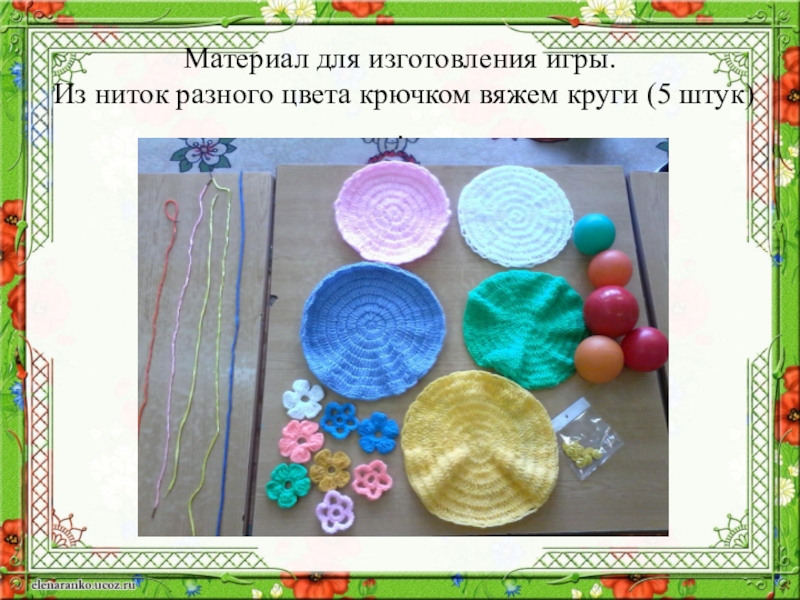Слайд 2Материал для изготовления игры. Из ниток разного цвета крючком вяжем круги (5