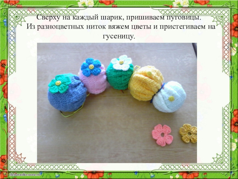 Сверху на каждый шарик, пришиваем пуговицы.   Из разноцветных ниток вяжем цветы и пристегиваем на гусеницу.