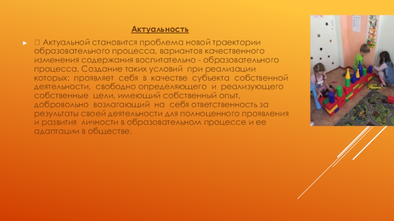 изменения содержания воспитательно - образовательного процесса. Создание таких условий при реализации которых: проявляет себя в качестве субъекта собственной деятельности, свободно определяющего и реализующего собственные цели, имеющий собственный опыт, добровольно возлагающий на себя ответственность за результаты своей деятельности для полноценного проявления и развития личности в образовательном процессе и ее адаптации в обществе.