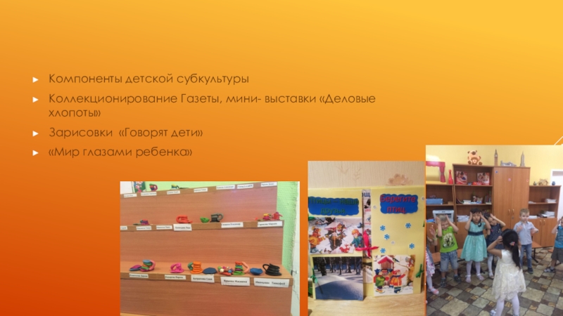 Компоненты детской субкультуры группы -Зарисовки «Говорят дети» - Газеты, мини – выставки -« Деловые хлопоты» - Коллекционирование «Сюрпризная коробочка» -Мини – музеи, выставки - «Мир глазами ребенка» - «Наш веселый детский сад»