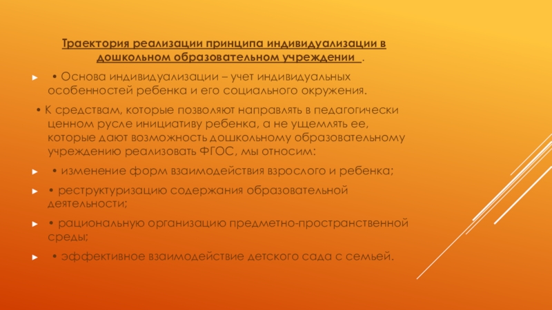 Слайд 6Траектория реализации принципа индивидуализации в дошкольном образовательном учреждении .