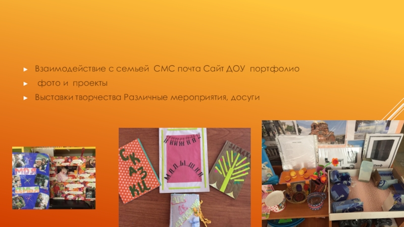 Слайд 11Взаимодействие с семьей СМС почта Сайт ДОУ портфолио