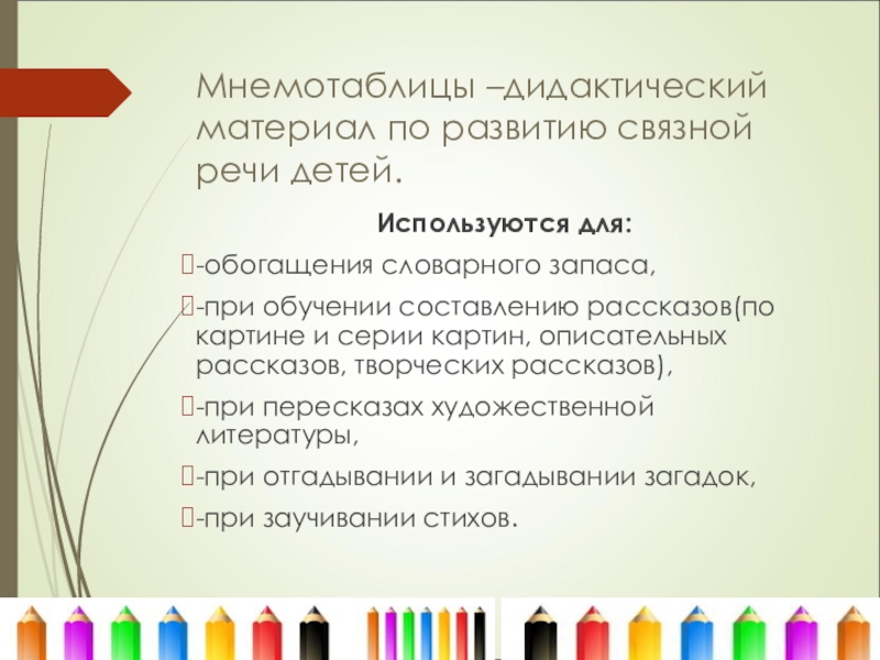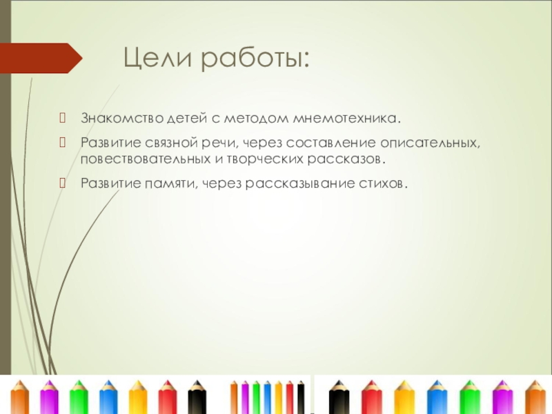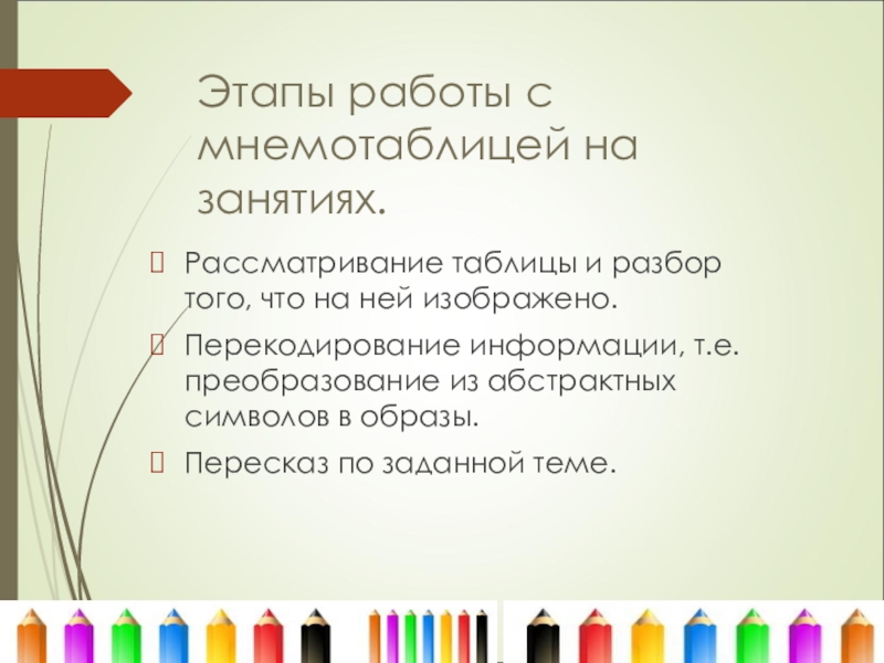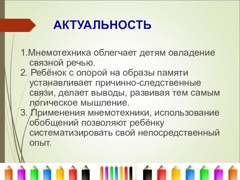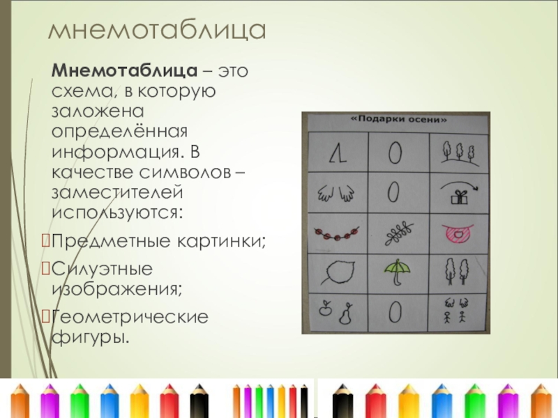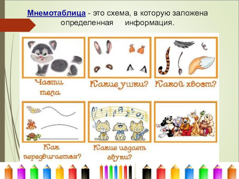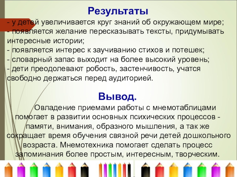 Овладение приемами работы с мнемотаблицами помогает в развитии основных психических процессов - памяти, внимания, образного мышления, а так же сокращает время обучения связной речи детей дошкольного возраста. Мнемотехника помогает сделать процесс запоминания более простым, интересным, творческим.