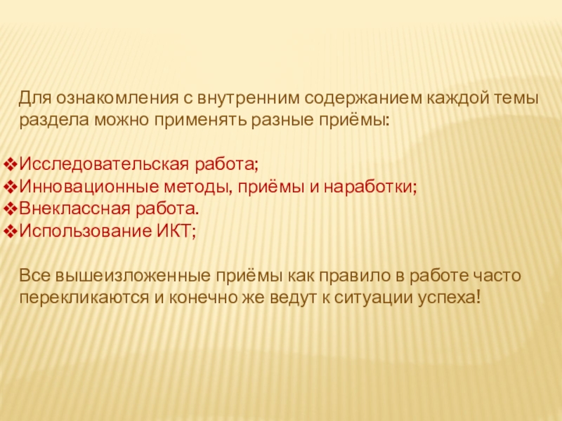 Слайд 8Для ознакомления с внутренним содержанием каждой темы раздела можно применять разные