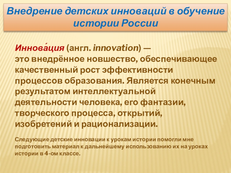 Следующие детские инновации к урокам истории помогли мне подготовить материал к дальнейшему использованию их на уроках истории в 4-ом классе.
