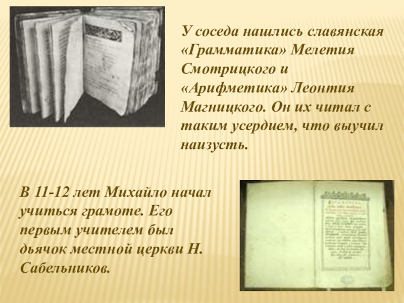 Слайд 14У соседа нашлись славянская «Грамматика» Мелетия Смотрицкого и «Арифметика» Леонтия Магницкого.