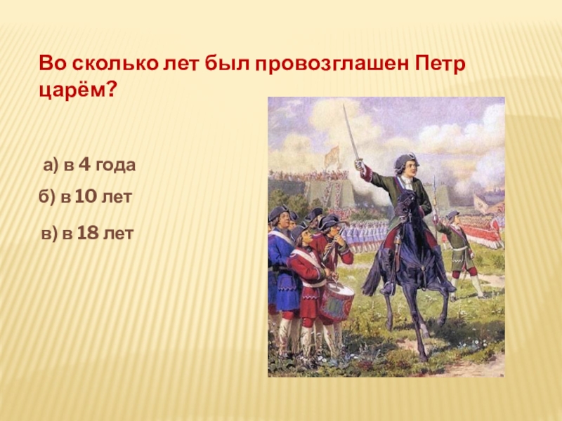 Слайд 48Во сколько лет был провозглашен Петр царём?