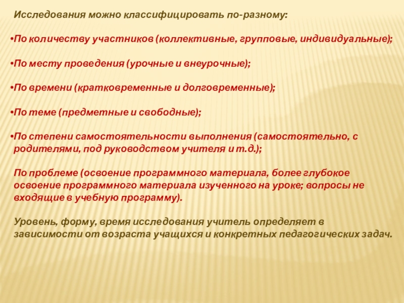 Уровень, форму, время исследования учитель определяет в зависимости от возраста учащихся и конкретных педагогических задач.