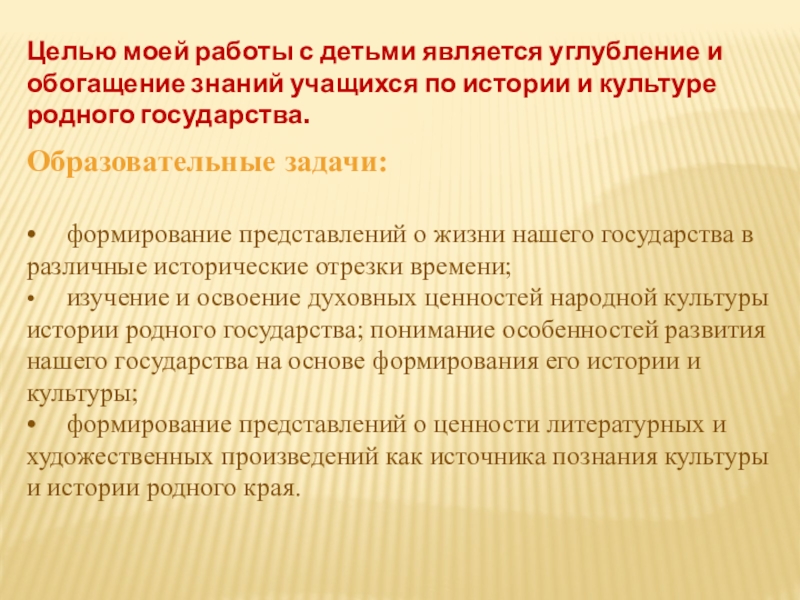 • изучение и освоение духовных ценностей народной культуры истории родного государства; понимание особенностей развития нашего государства на основе формирования его истории и культуры;