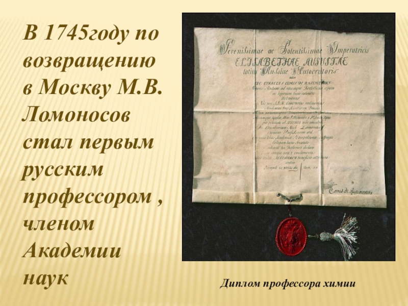 В 1745году по возвращению в Москву М.В. Ломоносов стал