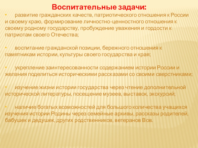• укрепление заинтересованности содержанием истории России и желания поделиться историческими рассказами со своими сверстниками;