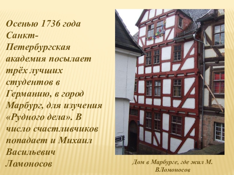 трёх лучших студентов в Германию, в город Марбург, для изучения «Рудного дела». В число счастливчиков попадает и Михаил Васильевич Ломоносов