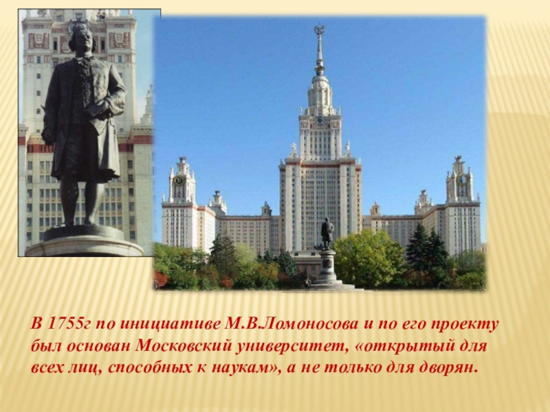 Слайд 22В 1755г по инициативе М.В.Ломоносова и по его проекту был основан