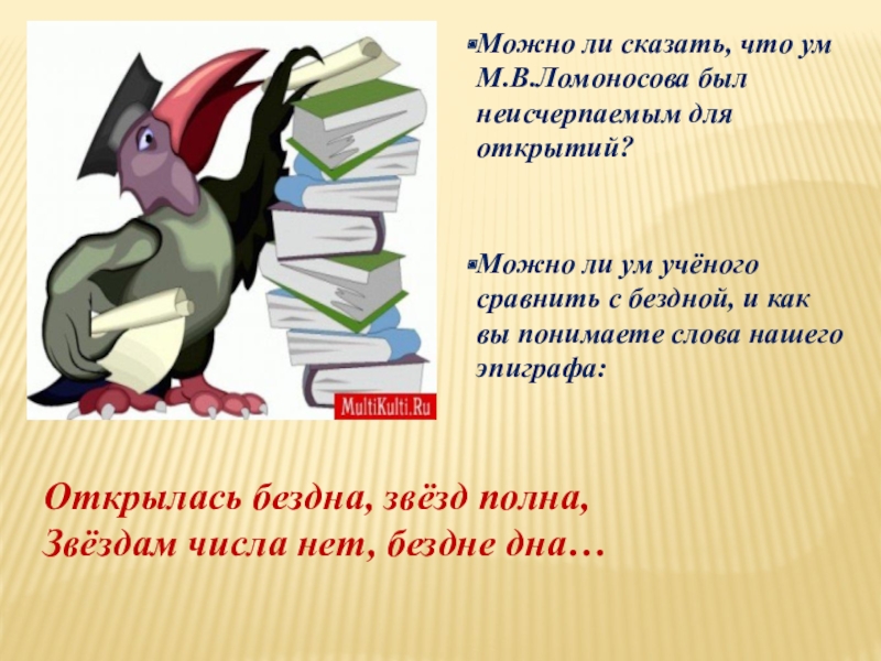 Слайд 33Можно ли сказать, что ум М.В.Ломоносова был неисчерпаемым для открытий?