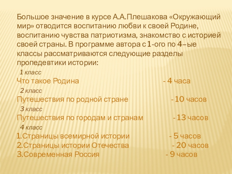 своей Родине, воспитанию чувства патриотизма, знакомство с историей своей страны. В программе автора с 1-ого по 4–ые классы рассматриваются следующие разделы пропедевтики истории: