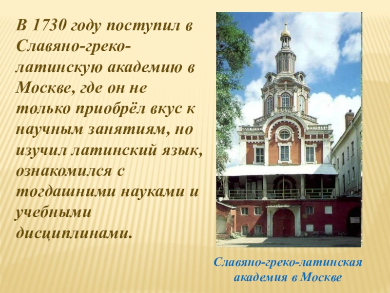 Слайд 16В 1730 году поступил в Славяно-греко-латинскую академию в Москве, где он
