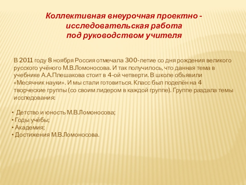 8 ноября Россия отмечала 300-летие со дня рождения великого русского учёного М.В.Ломоносова. И так получилось, что данная тема в учебнике А.А.Плешакова стоит в 4-ой четверти. В школе объявили «Месячник науки». И мы стали готовиться. Класс был поделён на 4 творческие группы (со своим лидером в каждой группе). Группе раздала темы исследования: