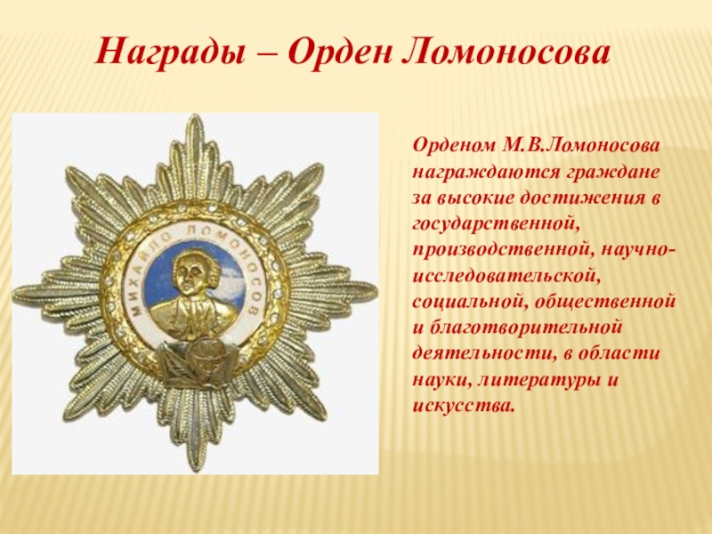 Орденом М.В.Ломоносова награждаются граждане за высокие достижения в