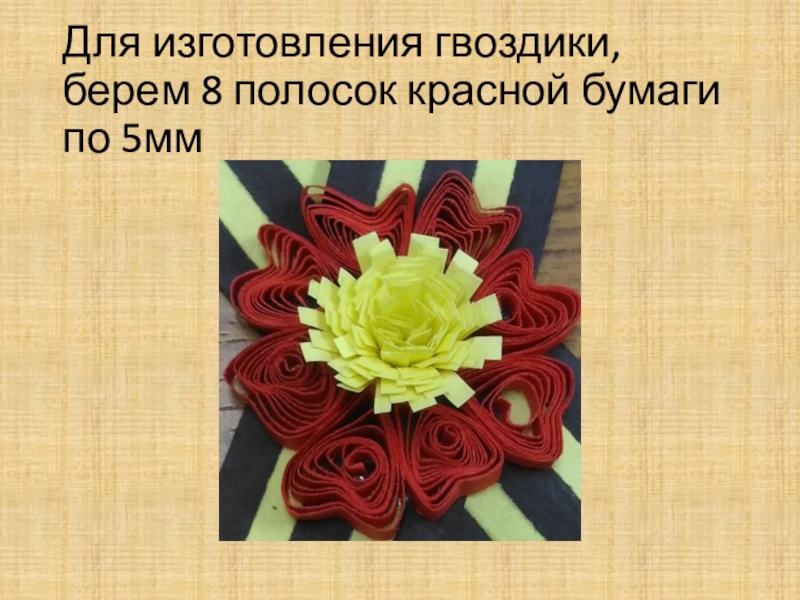 Слайд 5Для изготовления гвоздики, берем 8 полосок красной бумаги по 5мм