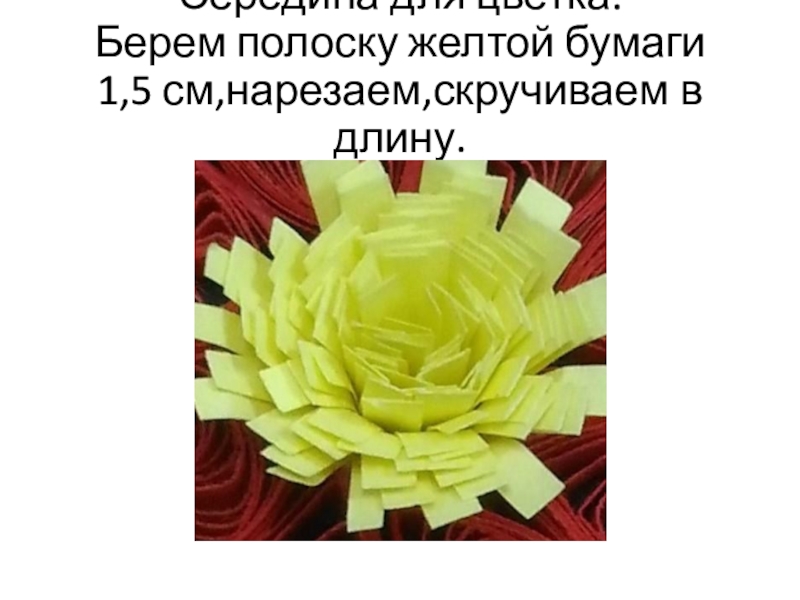 Слайд 6Середина для цветка. Берем полоску желтой бумаги 1,5 см,нарезаем,скручиваем в длину.