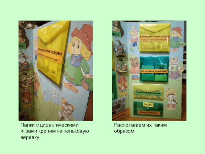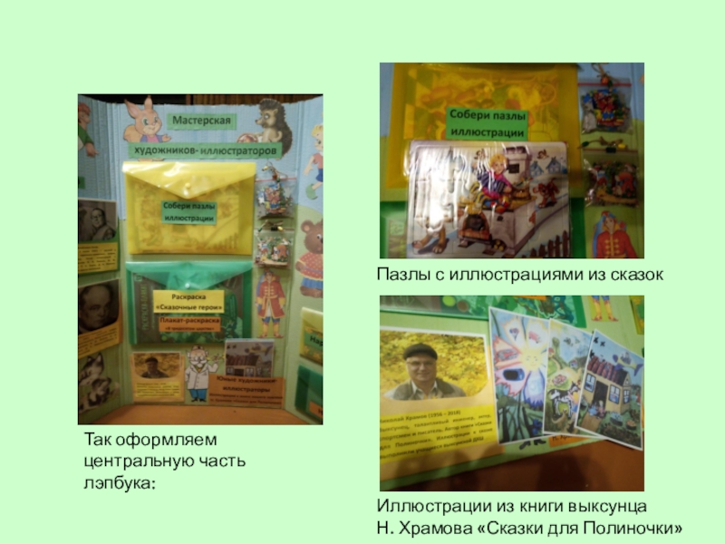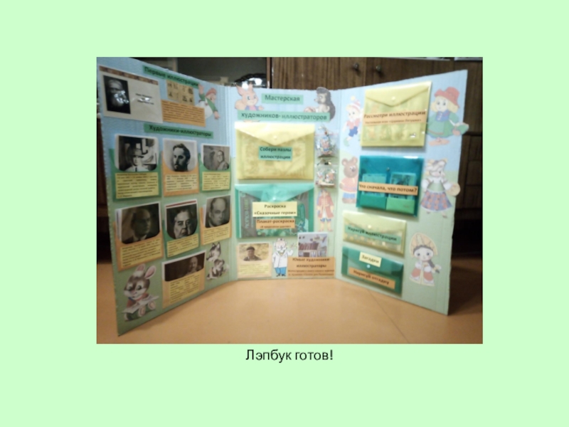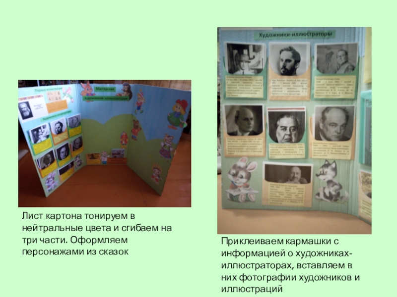 Приклеиваем кармашки с информацией о художниках-иллюстраторах, вставляем в них фотографии художников и иллюстраций