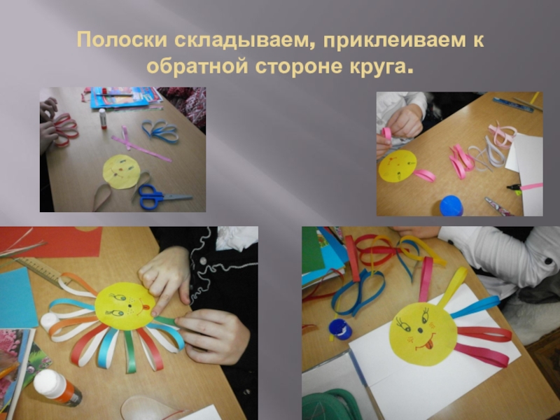 Слайд 6Полоски складываем, приклеиваем к обратной стороне круга.