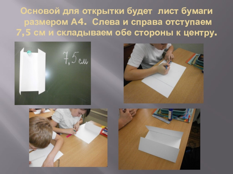 Слайд 2Основой для открытки будет лист бумаги размером А4. Слева и справа