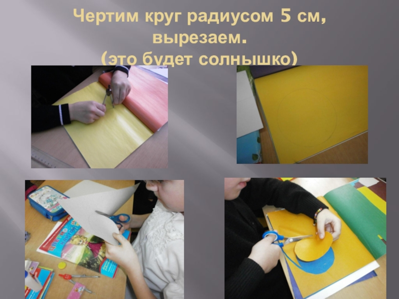 Слайд 3Чертим круг радиусом 5 см, вырезаем. (это будет солнышко)