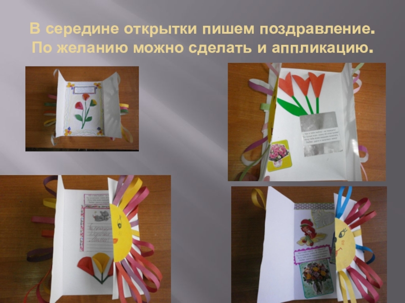 Слайд 9В середине открытки пишем поздравление. По желанию можно сделать и аппликацию.