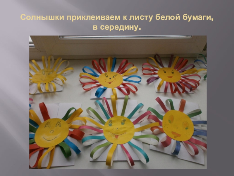 Слайд 7Солнышки приклеиваем к листу белой бумаги, в середину.