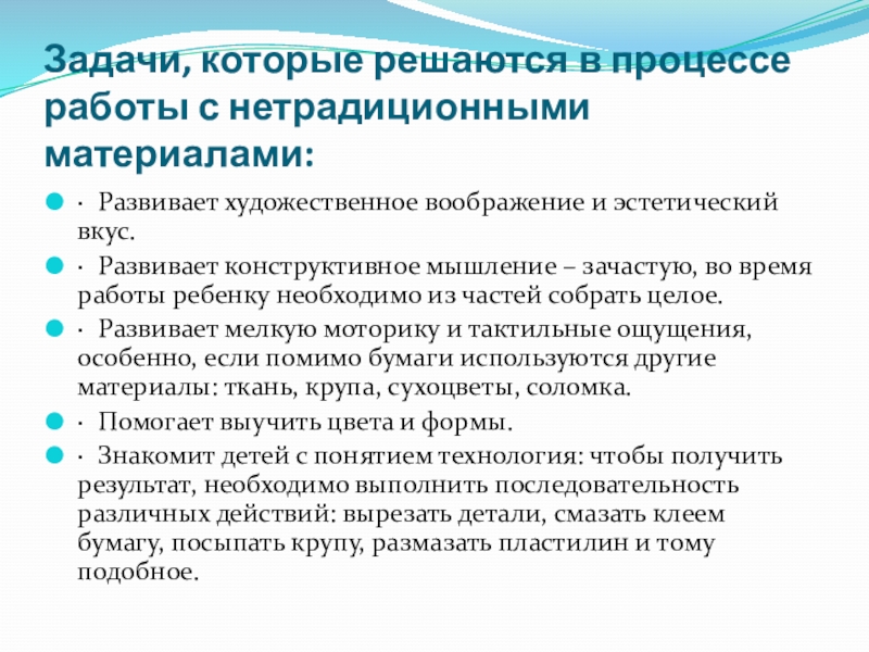Задачи, которые решаются в процессе работы с нетрадиционными материалами:·  Развивает художественное воображение и
